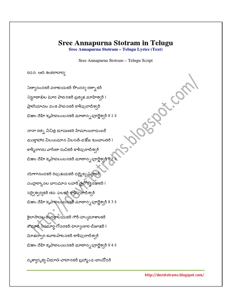 Priya Sisters Stothra Sudha Sri Annapoorna Stothram 12 ₹ 10 /. Balasubrahmanyam & Kalyani Menon Devi Stuthi Annapoorna Astakam 12 ₹ 11 /. MLV, Thiagarajan, Prema Shakthi Annapoorna Stotram 12 ₹ 12 /. Shruti Nada Shakti - EP Annapoorna Stotram 12 ₹ 13 /. Mambalam Sisters Daily Slokams Annapoorna Ashtakam 12 ₹ Sample text lyrics in English.